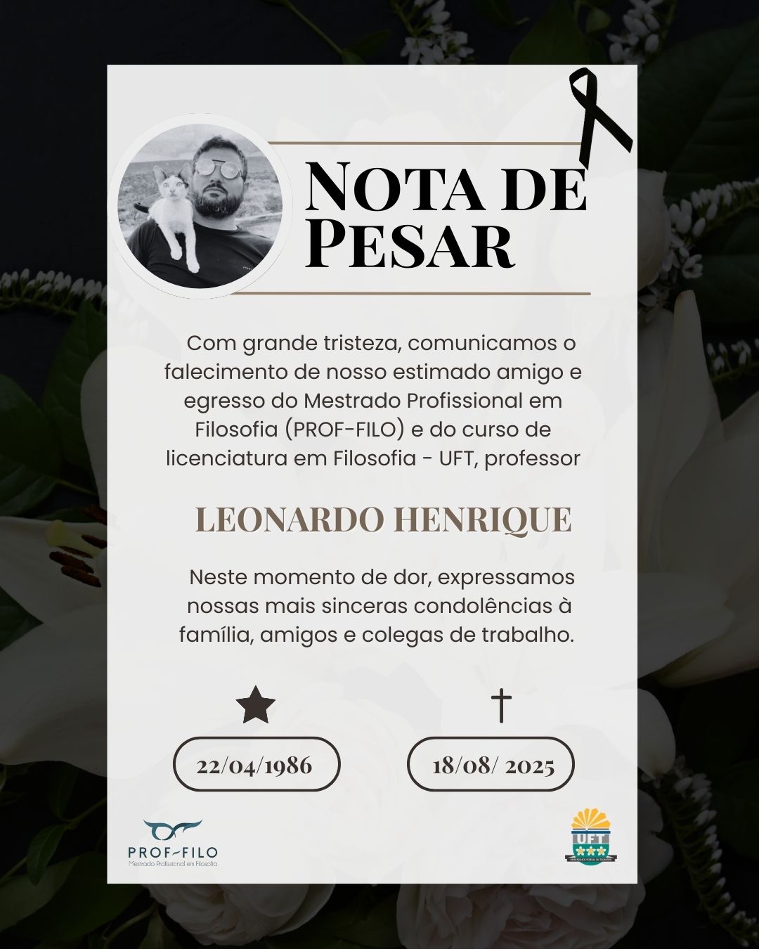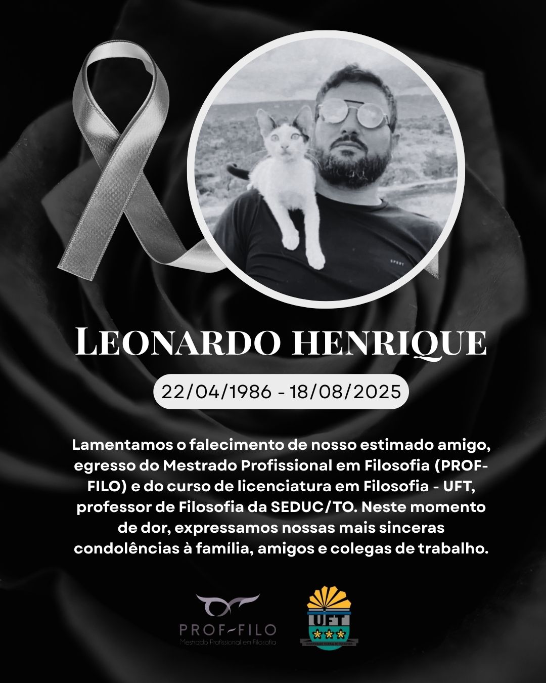 Em mensagem, a Coordenação informa que Leonardo Henrique foi um exemplo de sucesso da Filosofia da UFT. Graduou-se em Licenciatura em Filosofia e, logo em seguida, especializou em ética e filosofia política e, tornou-se Mestre em Filosofia pelo Mestrado Profissional em Filosofia (Prof-Filo) a partir de uma pesquisa que destacava a sua prática em sala de aula e a sua filiação à filosofia de Heidegger. Era professor do quadro efetivo da Seduc-TO e lecionava no ensino superior na rede particular de Palmas. Teve uma brilhante passagem como professor substituto na Licenciatura em Filosofia onde deixou saudades entre os estudantes.
