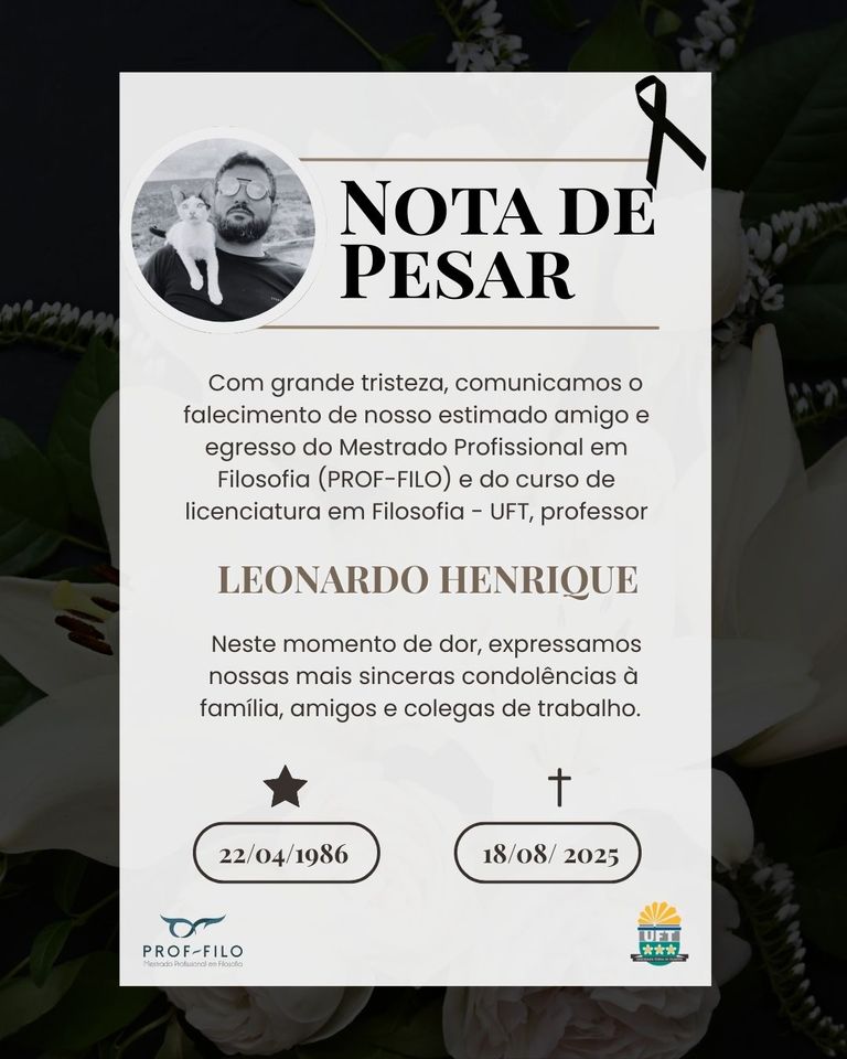 É com pesar que a Coordenação do Curso de Pós-Graduação (Mestrado Profissional) em Filosofia (Prof-Filo) comunica o falecimento do ex-professor substituto e também egresso tanto do Mestrado quanto do Curso de Licenciatura em Filosofia, Leonardo Henrique, ocorrido no último dia 18 de agosto de 2025.
