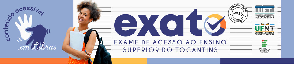 O Pró-reitor Graduação da Fundação Universidade Federal do Tocantins – UFT, no uso de suas atribuições e em consonância com o disposto na Resolução do Conselho Universitário (Consuni) nº 38, de 23 de abril de 2021, item 2.3 do Desafio II, itens 2.2.31 e 3.1.24 do Anexo I e item 2.3 do Anexo II torna público, pelo presente Edital, aprovado pela REITORIA, PROGRAD e CDE a realização do EXATO 2025 (2ª Edição) - Exame de Acesso ao Ensino Superior do Tocantins.