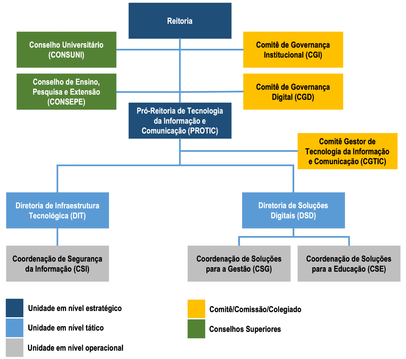 A Pró-Reitoria de Tecnologia da Informação e Comunicação (Protic) é a unidade administrativa que realiza a gestão de projetos, serviços e operações de Tecnologias da Informação e Comunicação (TICs) a partir das políticas e diretrizes da governança e Gestão de Tecnologia da Informação e Comunicação.