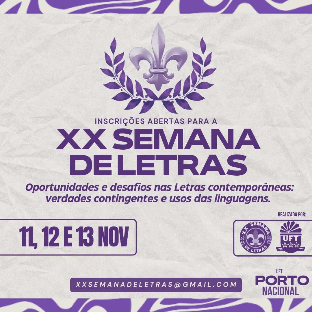 A 20ª Semana de Letras do Câmpus de Porto Nacional está com inscrições abertas para submissão de resumos para comunicações orais, minicursos e oficinas, além de inscrições de ouvintes. O evento, com o tema "Oportunidades e desafios nas Letras contemporâneas: verdades contingentes e usos das linguagens", acontecerá presencialmente nos dias 11, 12 e 13 de novembro de 2024.