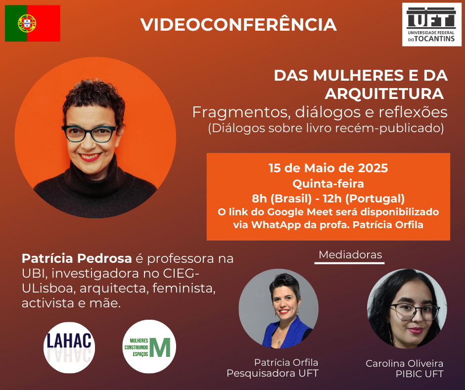 A apresentação do livro, prefaciado por Zaida Muxí Martinez, faz parte das atividades da disciplina "História e Crítica da Arquitetura e da Cidade Moderna e Contemporânea e também do grupo de pesquisa Mulheres na Arquitetura e Urbanismo (GPMAU/CNPq). O evento é destinado a estudantes, mas a professora Patrícia Orfila, organizadora da atividade, informa que para pessoas interessadas o link do encontro virtual pode ser enviado por e-mail. A solicitação deve ser feita para o endereço patriciaorfila@uft.edu.br.
