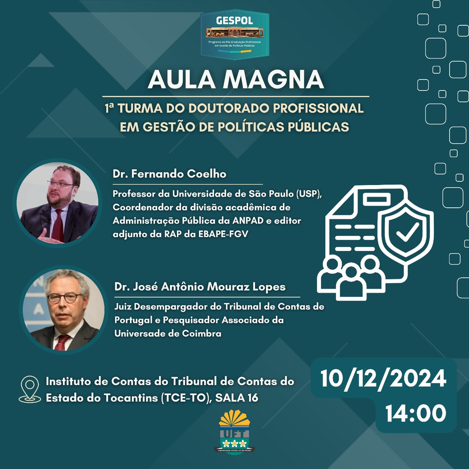 Mais uma trajetória acadêmica terá início na Universidade Federal do Tocantins! Nesta terça-feira, 10 de novembro, às 14h, no Instituto de Contas do Tribunal de Contas do Estado do Tocantins (TCE/TO) será realizada a aula magna da primeira turma do Programa de Pós-Graduação em Gestão de Políticas Públicas (Gespol), modalidade doutorado. Promovido em parceria com o TCE/TO, o curso busca formar gestores públicos em um alto nível de qualificação para atuarem na área, além de criar produtos que possam contribuir para o desenvolvimento e melhoria nas práticas dos orgãos públicos.