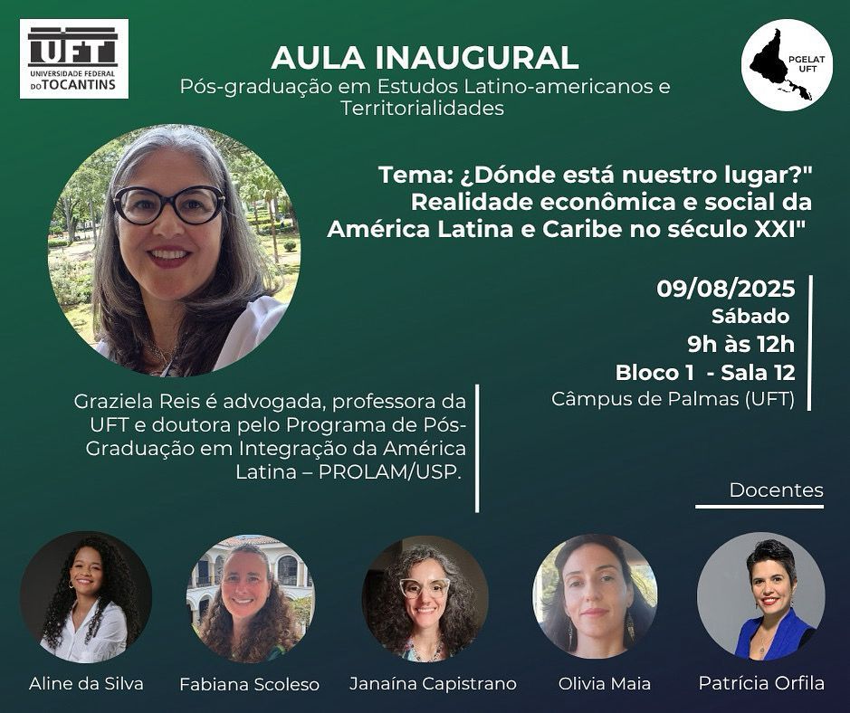 Ocorre neste sábado (9 de agosto), das 9h às 12h, na sala 12 do Bloco I, do Câmpus de Palmas, a aula inaugural da 2ª turma do curso de pós-graduação (em nível de especialização) em Estudos Latino-americanos e Territorialidades (PGELAT). A professora Dr.ª Graziela Reis, do curso de Direito do Câmpus de Palmas, ministrará a aula que tem como título "¿Dónde está nuestro lugar? Realidade econômica e social da América Latina e Caribe no século XXI".