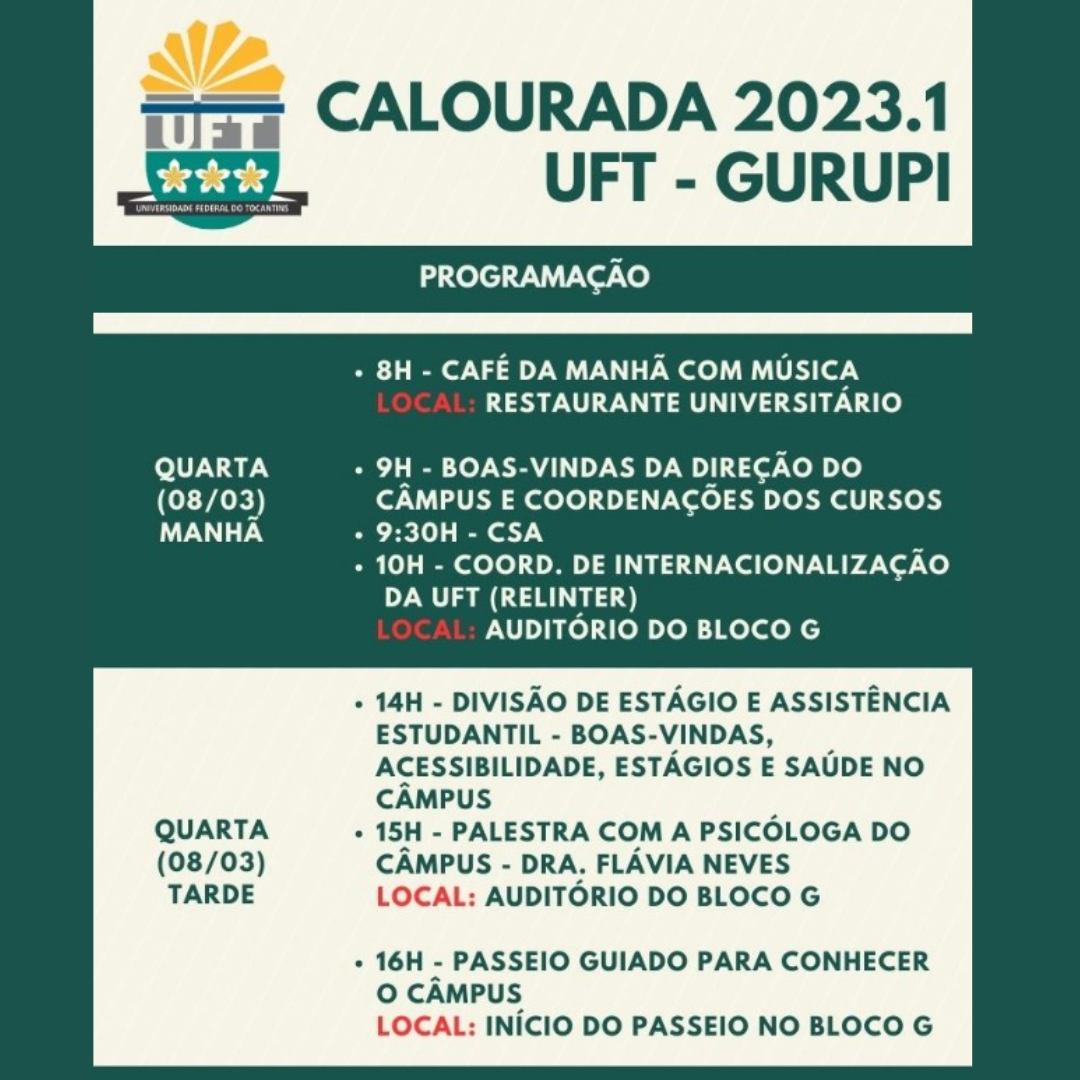 A fim de recepcionar de forma calorosa e acolhedora os novos alunos e apresentar a Instituição e seus serviços, a Universidade Federal do Tocantins (UFT), Câmpus de Gurupi, realiza nos próximos dias 08, 09 e 10 de março a Calourada UFT, que dará início ao primeiro semestre letivo de 2023.