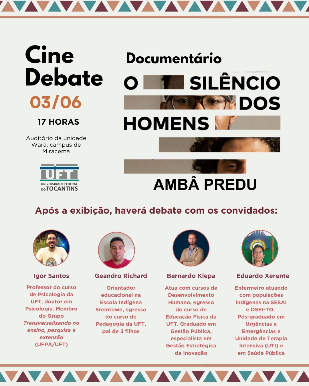 Após a exibição do documentário, ocorrerá um debate com a presença de convidados que abordarão temas como masculinidades, saúde mental, educação e vivências indígenas. Participam da roda de conversa o professor de Psicologia da UFT e doutor em Psicologia, Igor Santos; o orientador educacional da Escola Indígena Sremtowe e egresso da UFT, Geandro Richard; o educador físico, palestrante e especialista em Gestão Estratégica da Inovação, também egresso da UFT, Bernardo Klepa; e o enfermeiro da Secretaria de Saúde Indígena (Sesai/TO), com atuação junto a populações indígenas, Eduardo Xerente.