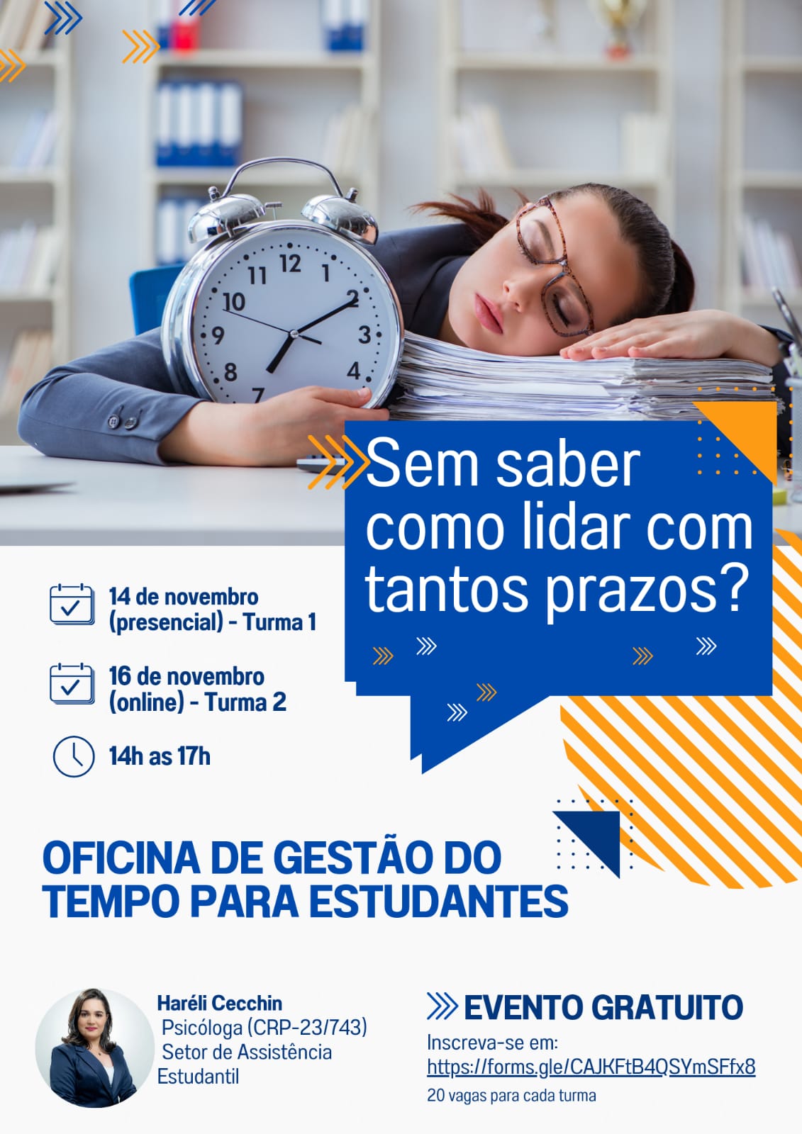 O Câmpus de Miracema está promovendo uma oficina para gerir o tempo dos estudantes nesta reta final do semestre. Com o tema "Gestão de tempo para estudantes", a oficina é ofertada nas modalidades presencial e online, com 20 vagas para cada turma.