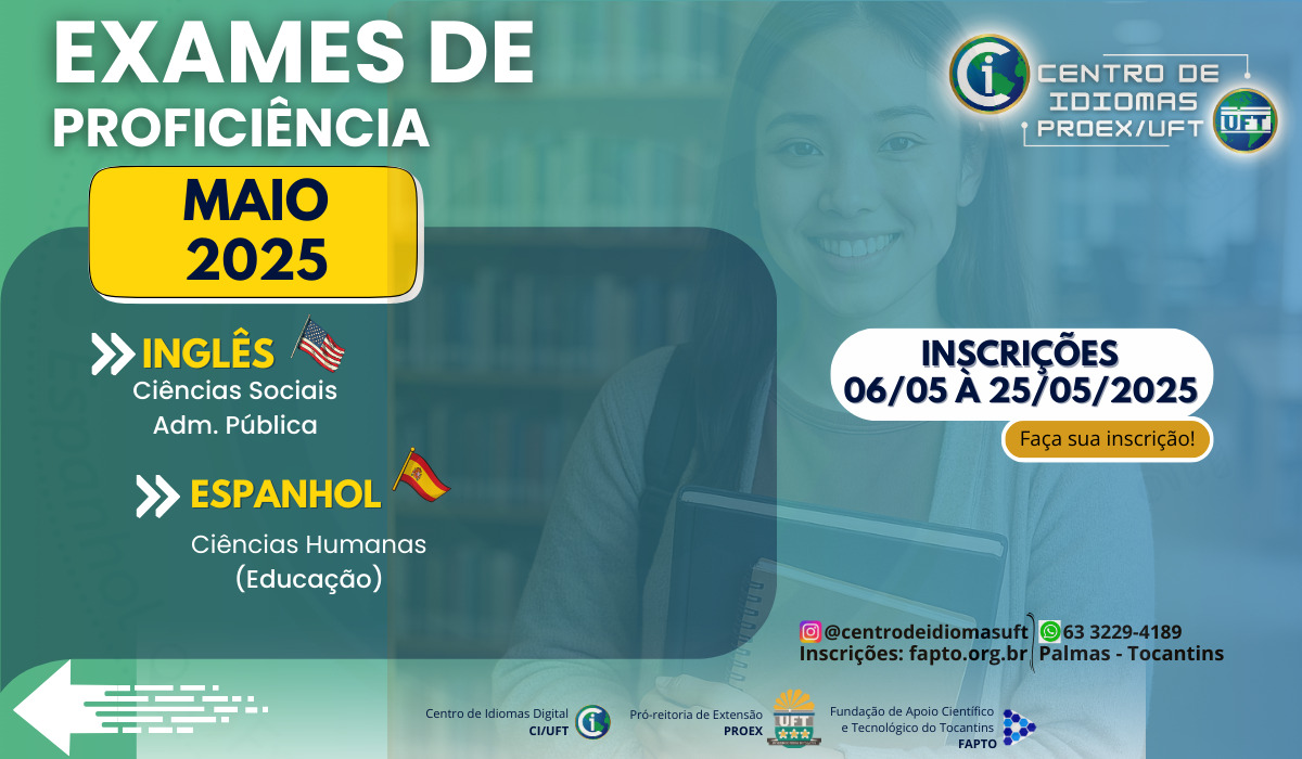 O Centro de Idiomas da Universidade Federal do Tocantins (UFT) está com inscrições abertas, entre os dias 6 e 25 de maio de 2025, para os Exames de Proficiência em Leitura de Línguas Estrangeiras, exigidos para ingresso em Programas de Pós-graduação Stricto Sensu, como Mestrados e Doutorados.