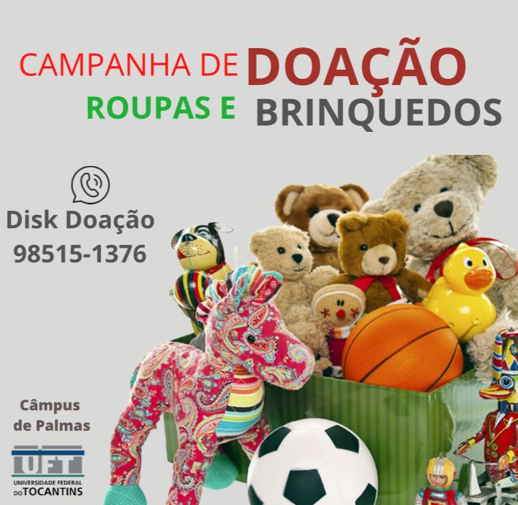 A campanha de arrecadação para o Dia das Crianças segue até o dia 08 de outubro. Dois pontos de coleta foram colocados no Câmpus de Palmas: Biblioteca e Protocolo da Reitoria. Também é possível contribuir por meio do Disk Doação (até o dia 10 de outubro), pelo contato disponibilizado: