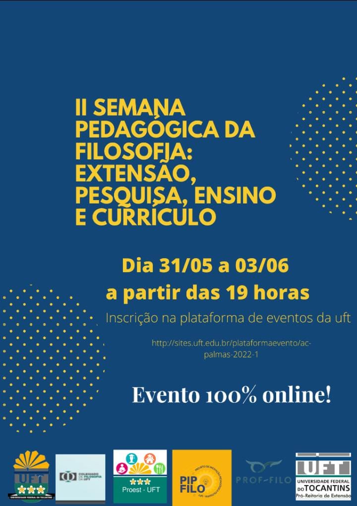 O Colegiado do curso de Filosofia, da Universidade Federal do Tocantins (UFT), em parceria com o Mestrado Profissional em Filosofia (PROF FILO), promove entre os dias 31 de maio e 03 de junho, a II Semana Pedagógica da Filosofia. O evento será totalmente online e tem como tema “Extensão, Pesquisa, Ensino e Currículo''. As atividades se iniciam sempre às 19h, pelo Google Meet. Os interessados devem realizar as inscrições pela Plataforma de Eventos da UFT.