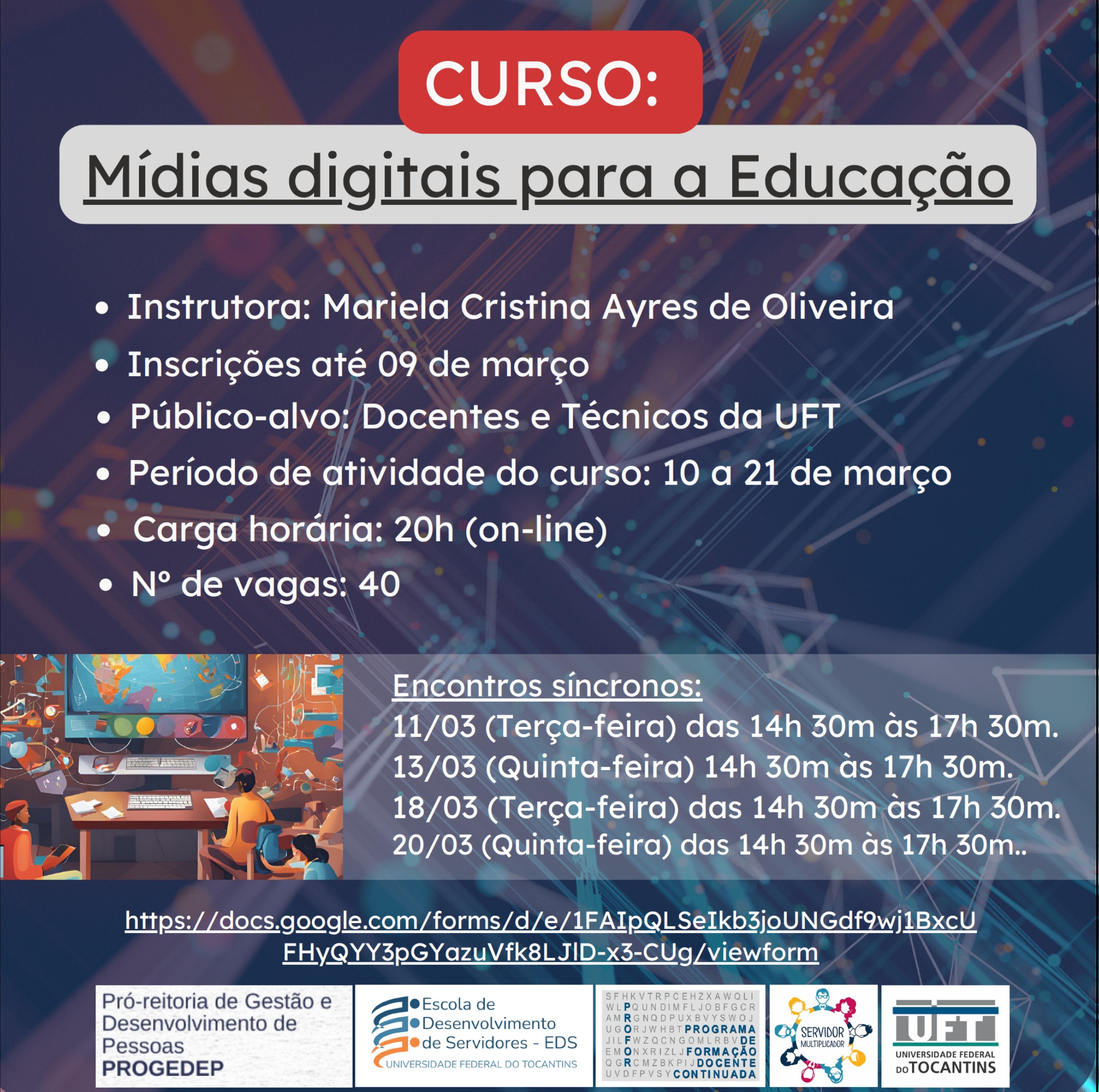 Estão abertas, até o dia 9 de março de 2025, as inscrições para o curso on-line "Mídias Digitais para a Educação", voltado para docentes e técnicos administrativos da Universidade Federal do Tocantins (UFT).