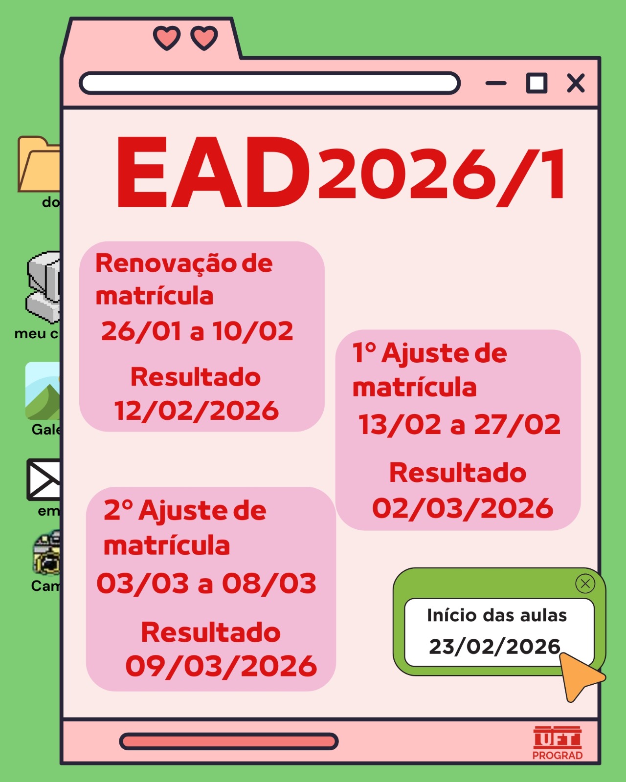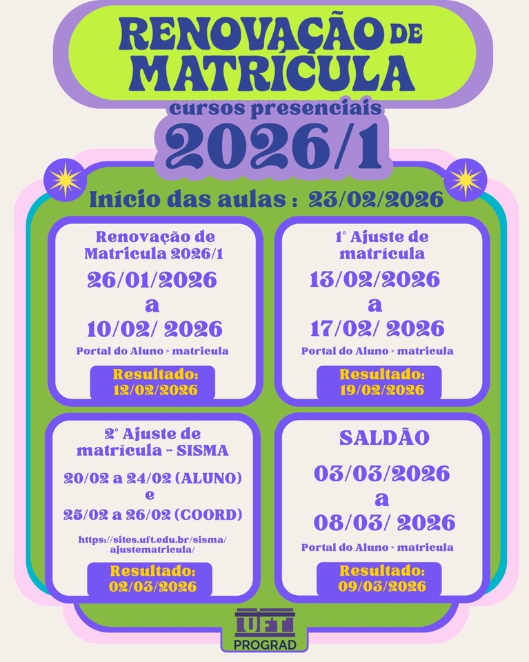 A Pró-Reitoria de Graduação (Prograd) da Universidade Federal do Tocantins (UFT) informa que o período de renovação de matrícula para o semestre letivo 2026/1 será realizado de 26 de janeiro a 10 de fevereiro, por meio do Portal do Aluno.