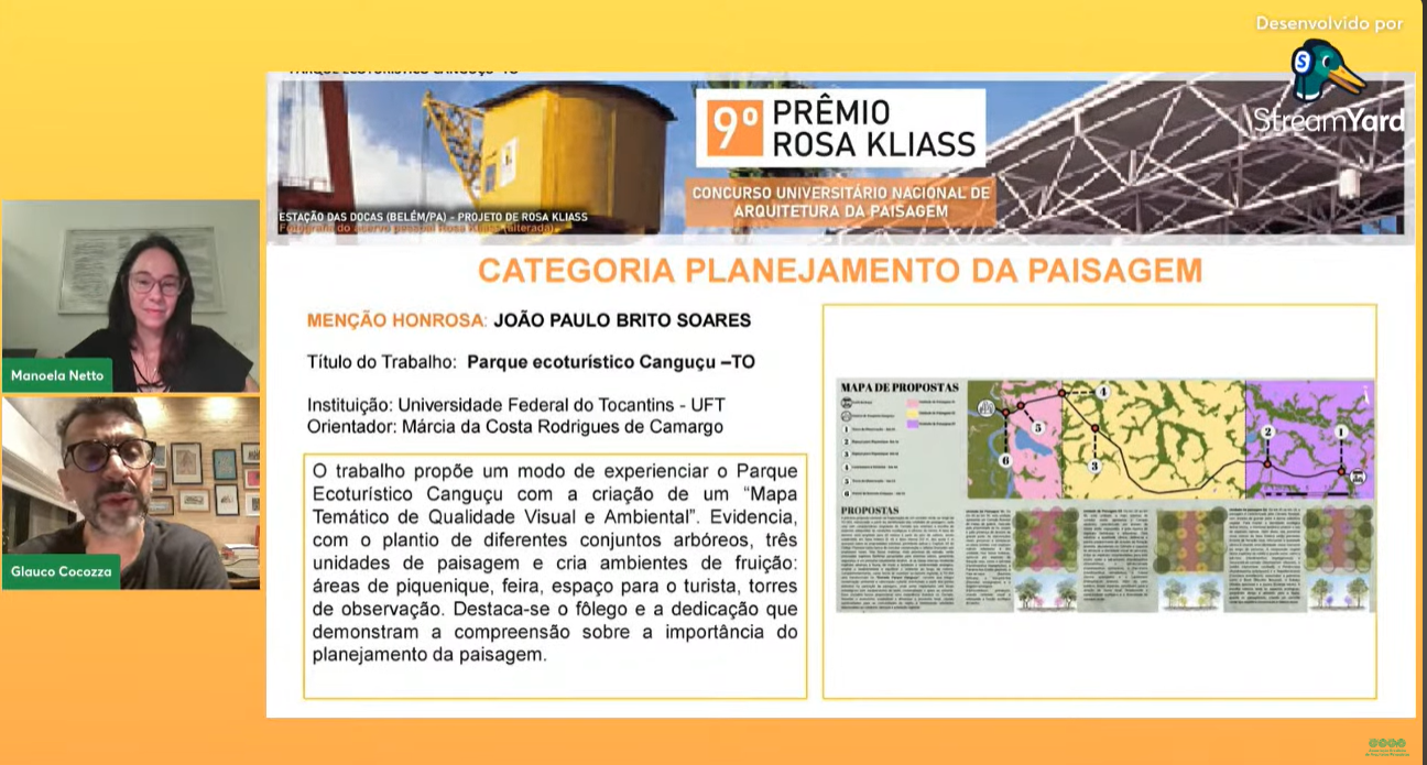 O egresso do curso de Arquitetura e Urbanismo da Universidade Federal do Tocantins (UFT), João Paulo Brito Soares, recebeu Menção Honrosa no Prêmio Rosa Kliass de Arquitetura da Paisagem. No trabalho premiado, o ex-acadêmico propôs o desenvolvimento do Parque Ecoturístico Canguçu - observatório científico da Universidade.
