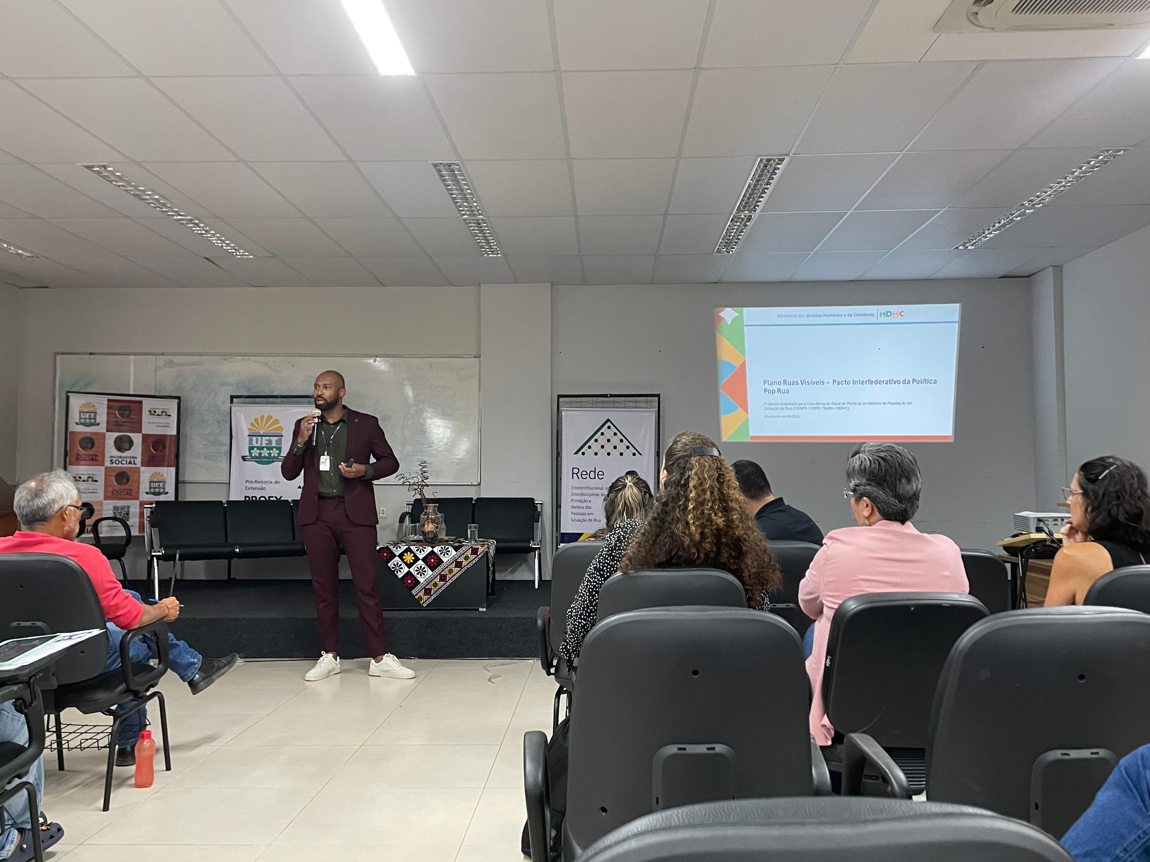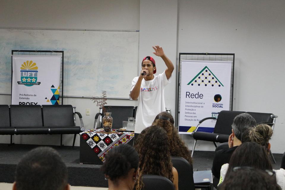Durante todo o dia, no auditório da Reitoria, cerca de 50 pessoas participaram da reunião ampliada da Rede com a presença do coordenador-geral de Políticas para os Direitos da População em Situação de Rua do Ministério dos Direitos Humanos e da Cidadania (MDHC), Cleyton Luiz da Silva Rosa, com o objetivo de discutir ações e articular parcerias voltadas para o atendimento da população em situação de rua. Um momento cultural abriu a programação com arte, denúncia e reflexão: o rapper 2ss MC, integrante do coletivo Rimadores dos Busão Tocantins, apresentou uma composição autoral que narra a dureza das "quebradas", a dor das famílias e o poder transformador da educação e da fé.