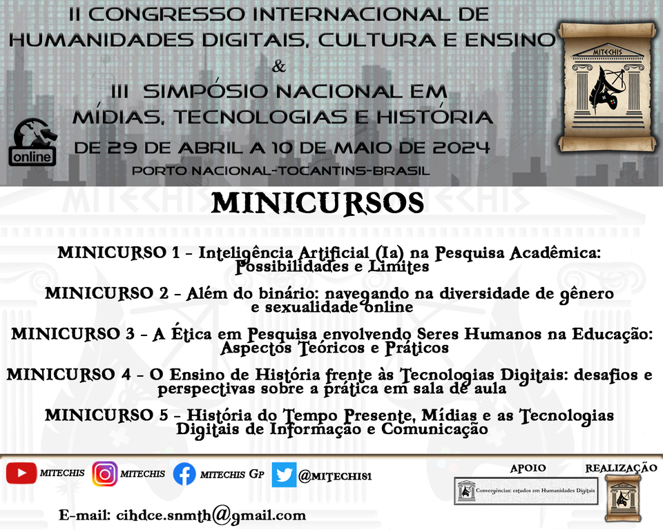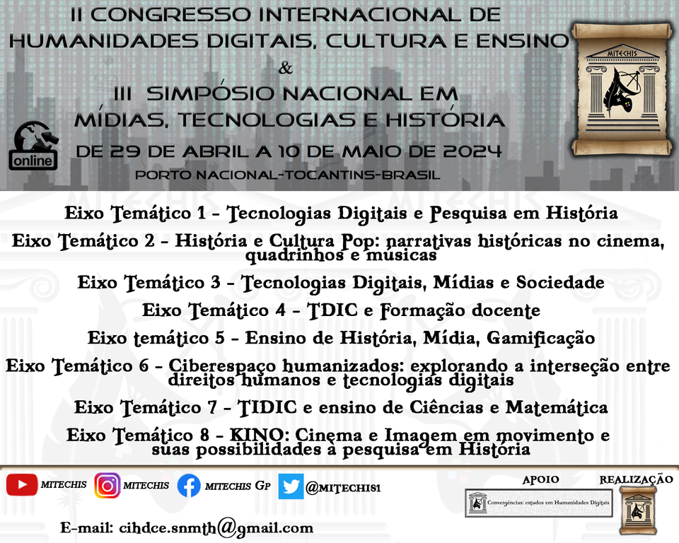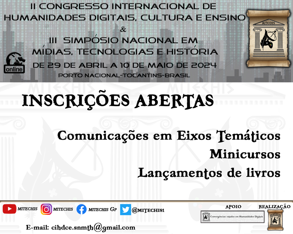 Estão abertas as inscrições para o II Congresso Internacional de Humanidades Digitais, cultura e Educação (II SIHDCE) e III Simpósio Nacional em Mídias, Tecnologias e História (SNMTH), que vai acontecer entre os dias 29 de abril e 10 de maio de 2024, de forma online pelo canal Mitechis no Youtube.