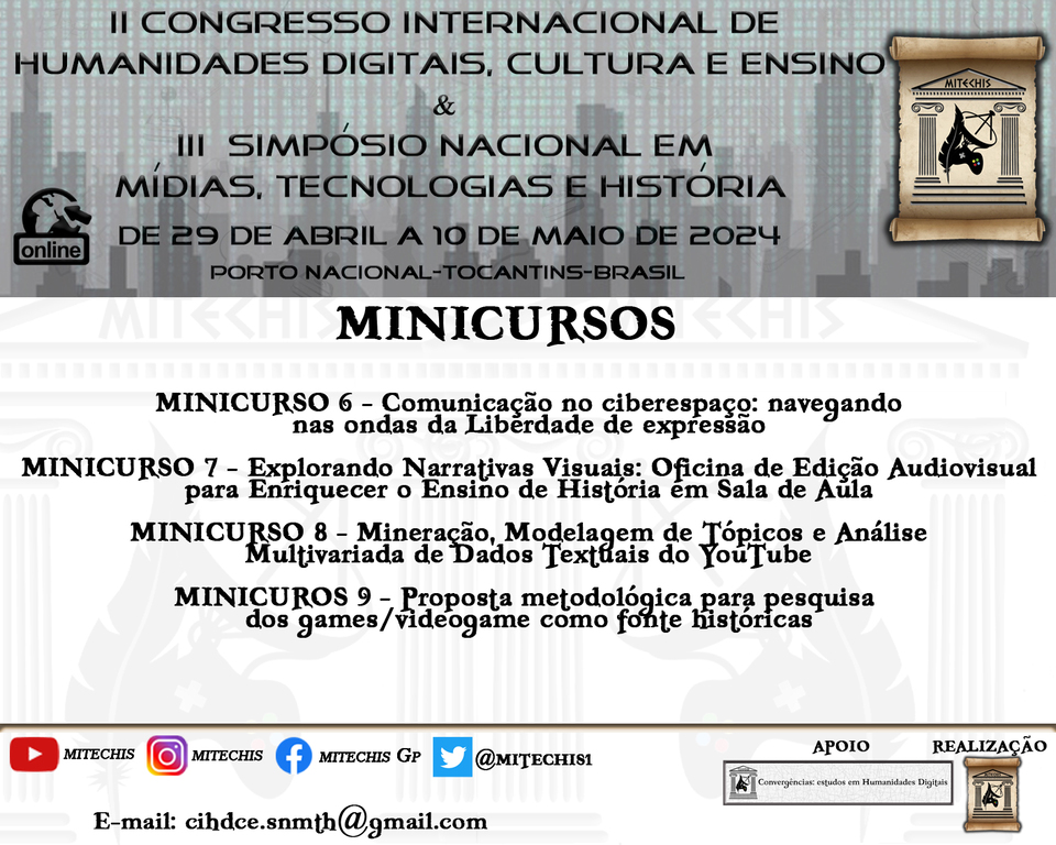 O evento é uma realização do Grupo de Pesquisa em Mídias, Tecnologias e História (MITECHIS) coordenado pelo Prof. Dr. George Leonardo Seabra Coelho do PPGHispam do Câmpus de Porto Nacional.