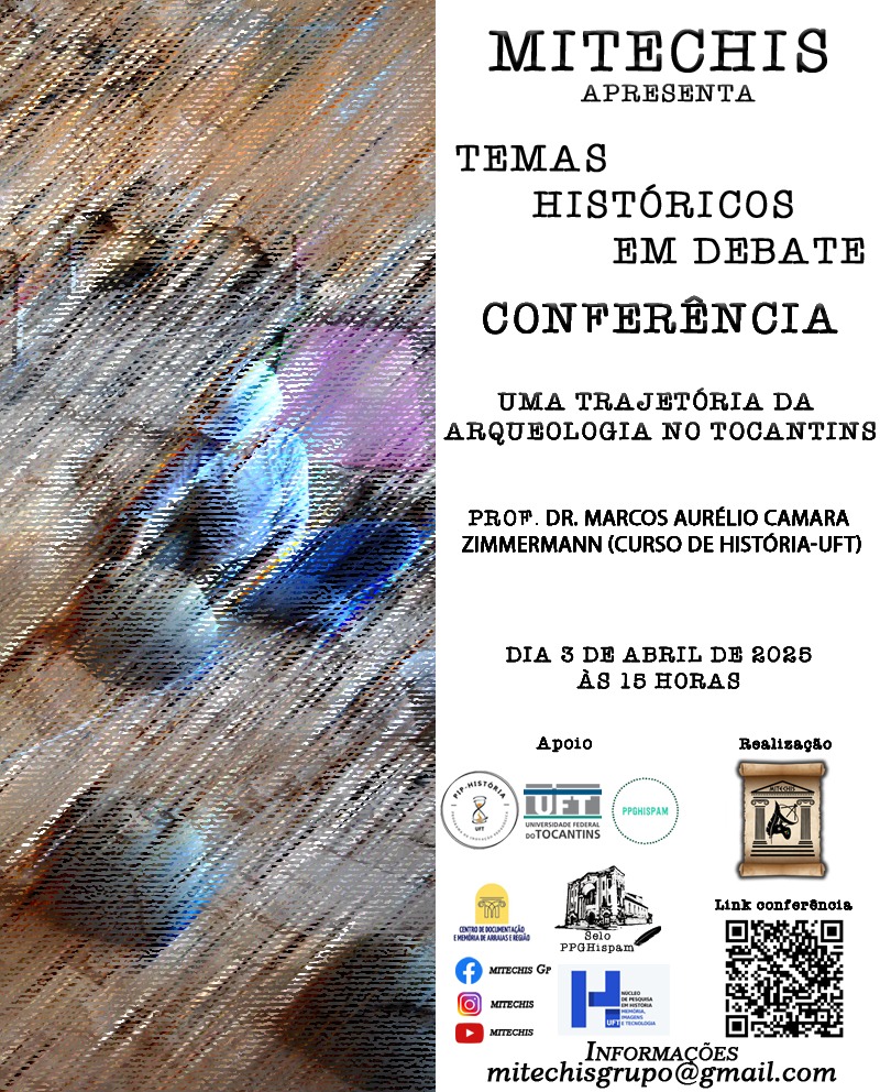 No dia 3 de abril, às 15h, será realizada a série de mesas online "Temas Históricos em Debate: Uma trajetória da Arqueologia no Tocantins". A conferência é organizada com a colaboração do Programa de Pós-Graduação em História das Populações Amazônicas (PPGHispam), do curso de História do Câmpus Porto Nacional, do Centro de Documentação e Memória de Arraias e região (CDMAR), do Selo Editorial do PPGHispam e do Núcleo de Estudos em História, Memória, Imagem e Tecnologias (NUHMIT). O evento será coordenado pelo professor George Leonardo Seabra Coelho, do PPGHispam-UFT.