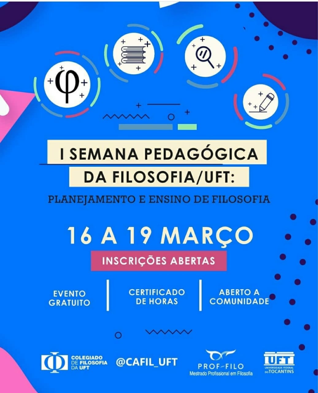 O curso de graduação em Filosofia em parceria com o Mestrado Profissional em Filosofia (ProFilo) da UFT realizam, de 16 a 19 de março de 2021, a I Semana Pedagógica da Filosofia.