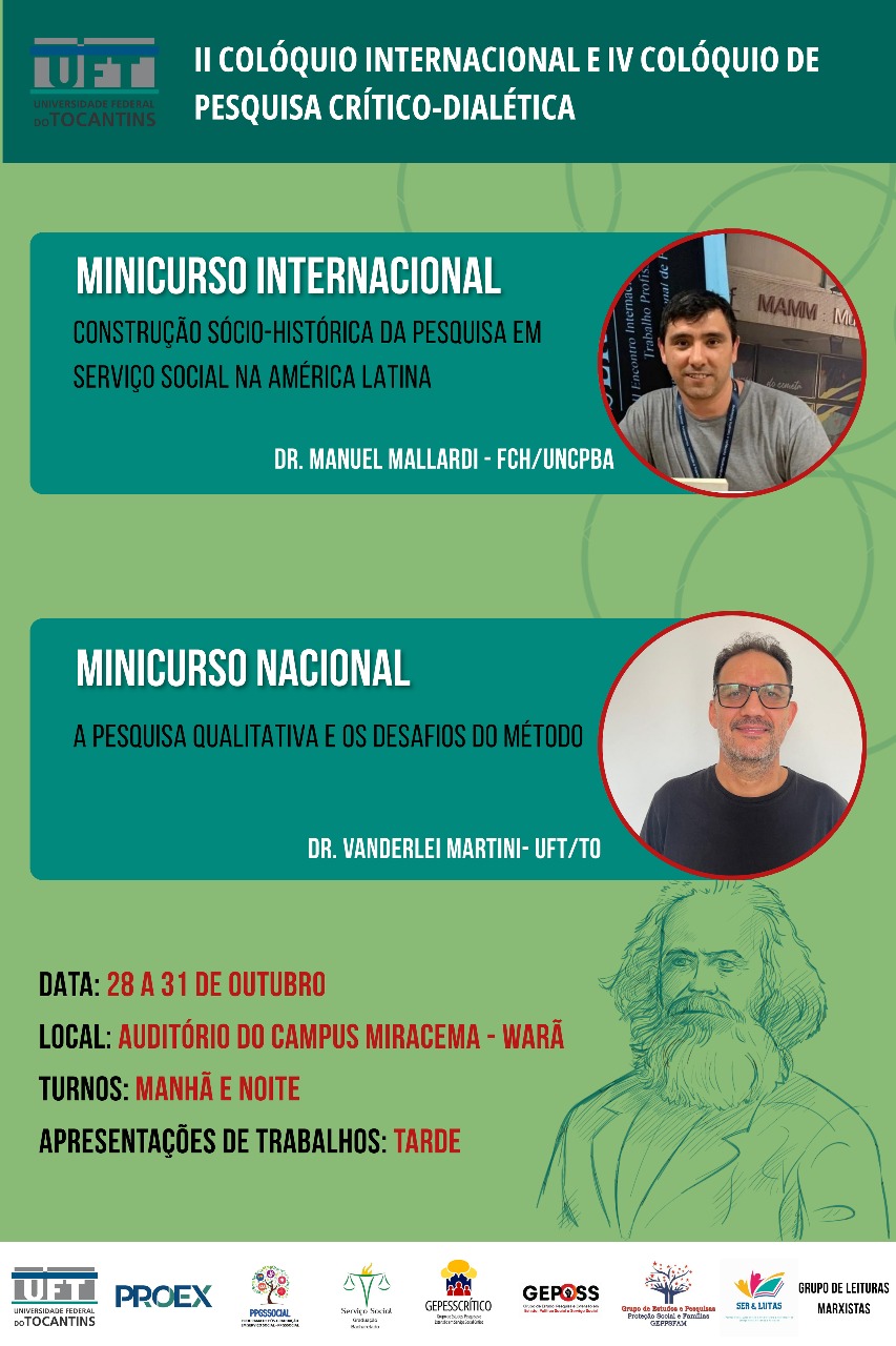 O II Colóquio Internacional e o IV Colóquio de Pesquisa Crítico-Dialética será realizado nos dias 28 e 30 de outubro, no auditório da unidade Warã no Câmpus de Miracema, com programação de manhã e à tarde. O evento terá minicursos nacional e internacional, ministrados pelos professores Manuel Mallardi, da Faculdade de Ciências Humanas da (UNCPBA), e Vanderlei Martini, da Universidade Federal do Tocantins (UFT). À tarde, a programação contará com apresentações de trabalhos.