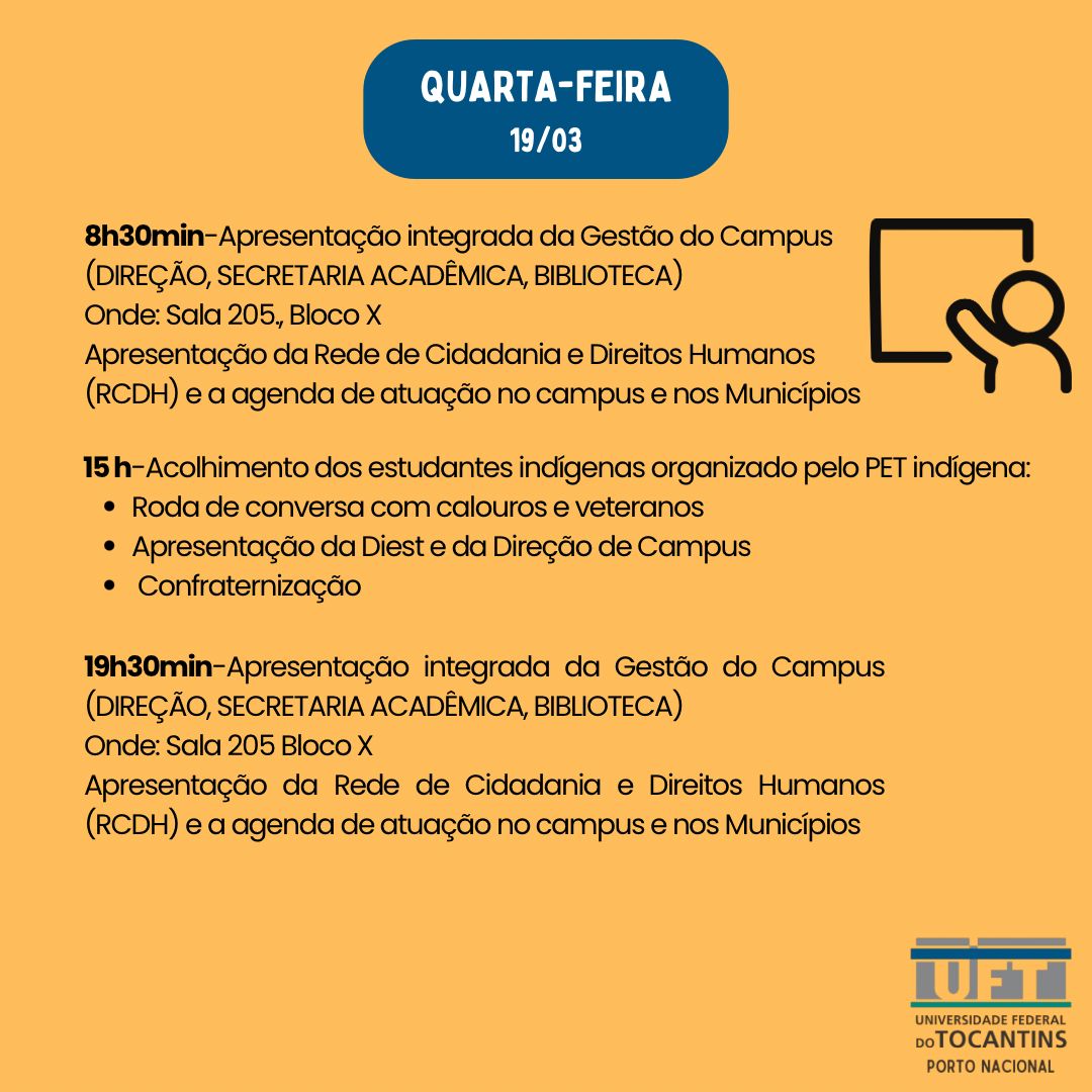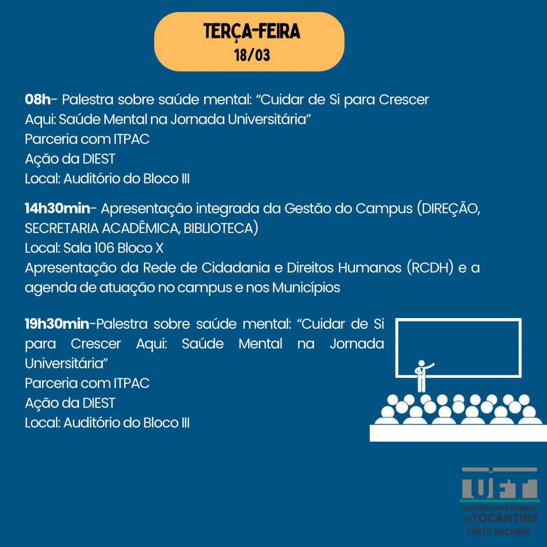 A Divisão de Estágios e Assistência Estudantil (Diest) manterá um atendimento contínuo ao longo do semestre, oferecendo serviços como acompanhamento pedagógico, orientações sobre estágios e assistência estudantil, além de oficinas mensais de prevenção à saúde para estudantes indígenas e quilombolas, em parceria com o ITPAC. Também serão promovidos grupos de aprendizagem para esses estudantes. As oficinas pedagógicas incluem temas como técnicas de estudo, organização acadêmica, apresentação oral de trabalhos, escrita de TCC e produção de textos acadêmicos. No dia 25 de março, haverá uma oficina sobre inscrição no Programa de Indicadores Sociais (Piso) e uso do sistema Cubo, disponível nos três turnos.