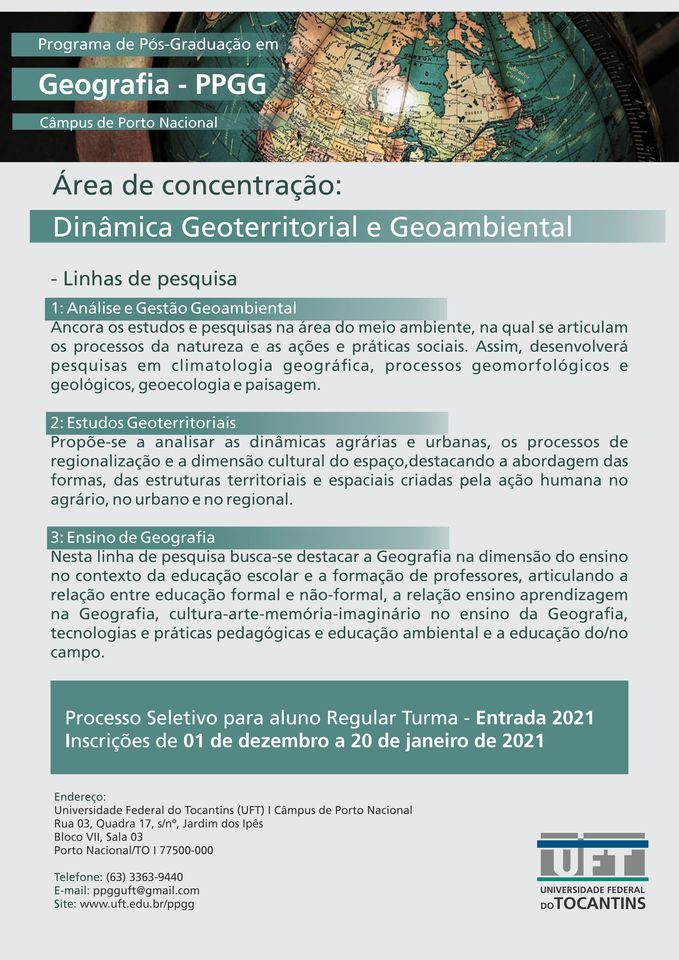 Com inscrições abertas até o dia 20 de janeiro de 2021, a Coordenação do Programa de Pós-Graduação em Geografia (PPGG) lançou Edital de Seleção para ingresso no curso de Mestrado Acadêmico em Geografia, Turma 2021/1.