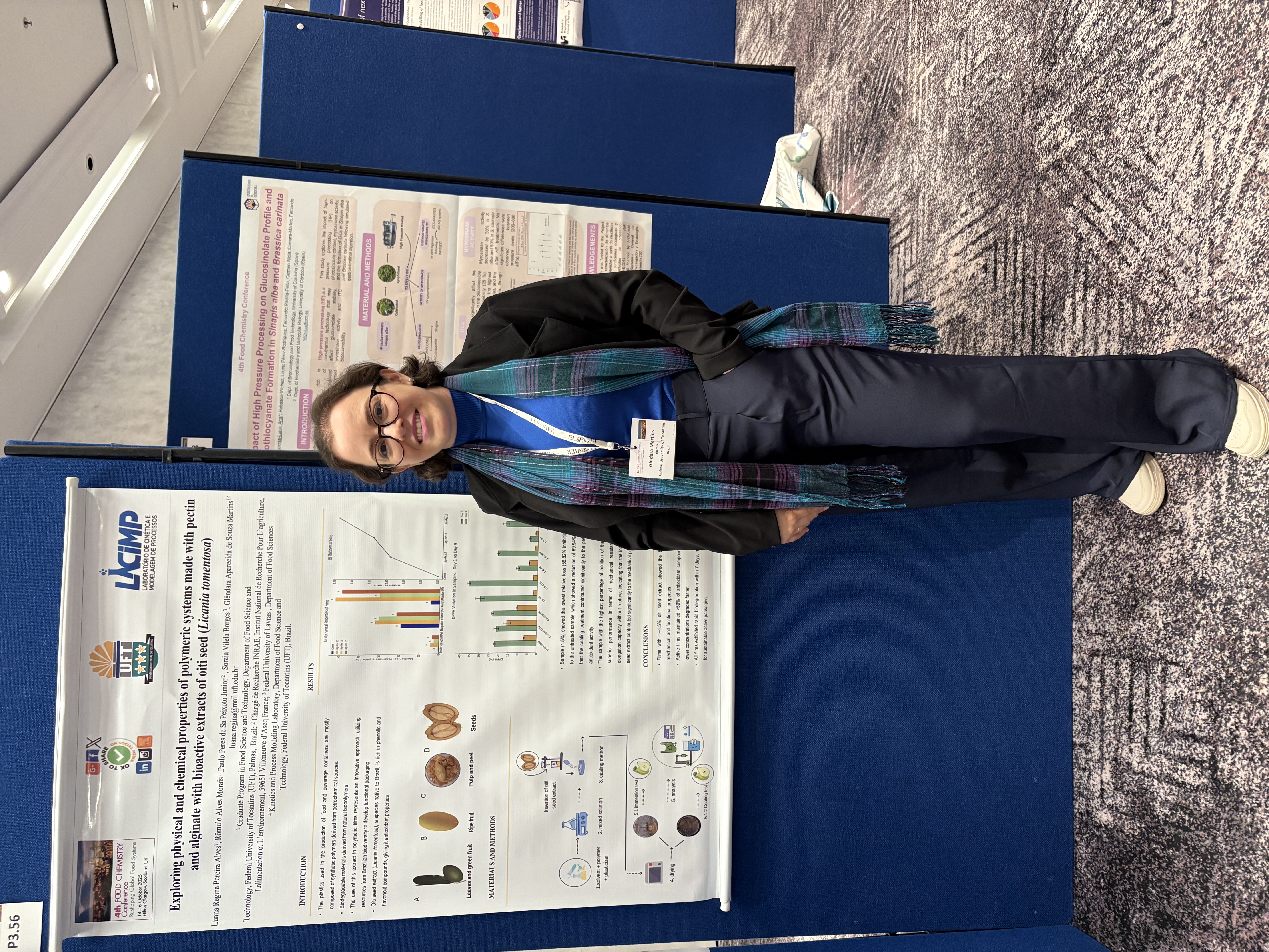 O trabalho científico intitulado “Exploring physical and chemical properties of polymeric system made with pectin and alginate with bioactive extracts of Oiti seed (Licania tomentosa)”, desenvolvido pela mestranda Luana Alves, do Programa de Pós-Graduação em Ciência e Tecnologia de Alimentos (PPGCTA), do Câmpus de Palmas, sob orientação da professora Glêndara Aparecida, foi apresentado na 4ª edição do Food Chemistry Conference, realizada pela editora Elsevier em Glasgow, na Escócia. O evento reuniu alguns dos principais pesquisadores da área de alimentos do mundo. O trabalho foi apresentado no evento pela docente Glêndara.
