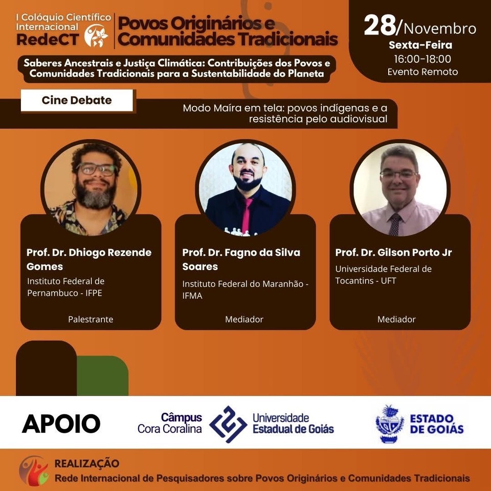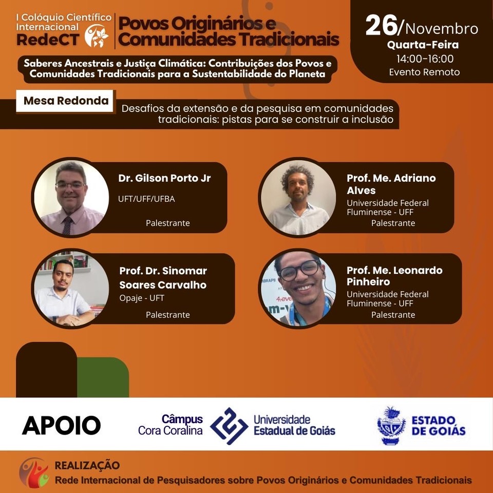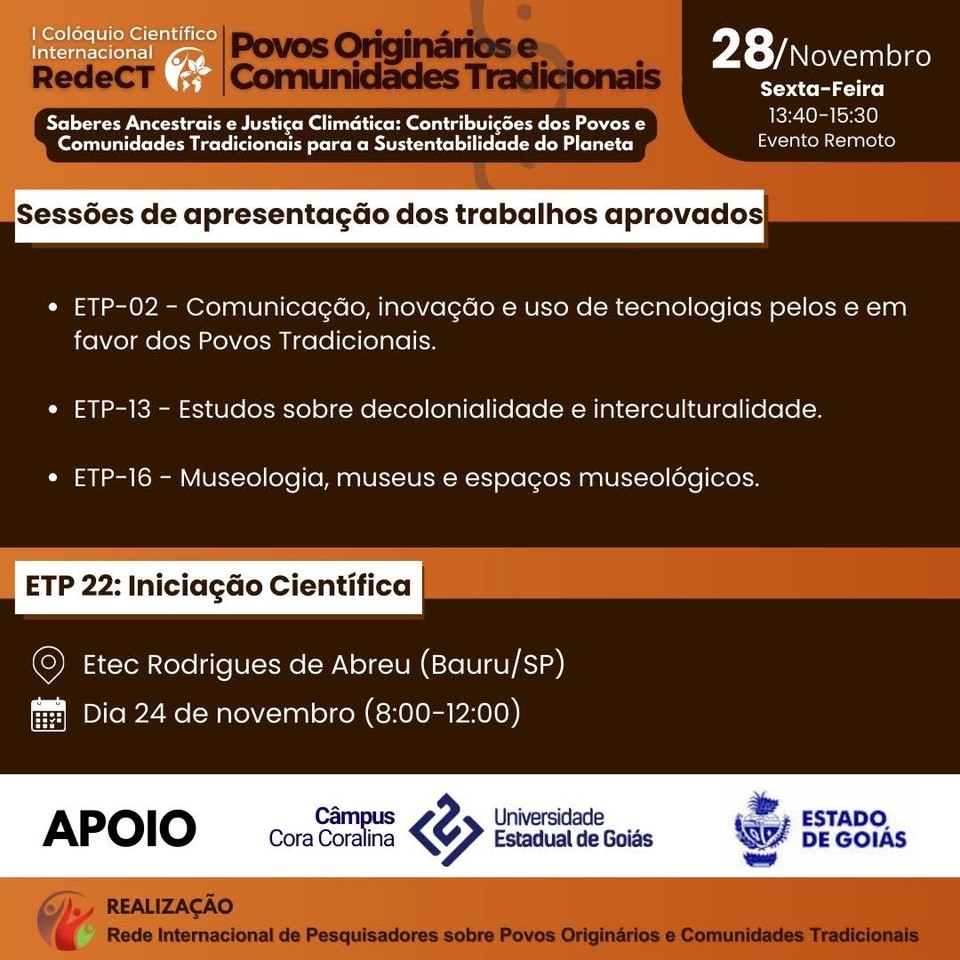 O I Colóquio Científico Internacional da RedeCT é organizado pela Rede Internacional de Pesquisadores sobre Povos Originários e Comunidades Tradicionais, com apoio da Universidade Estadual de Goiás – Câmpus Cora Coralina.