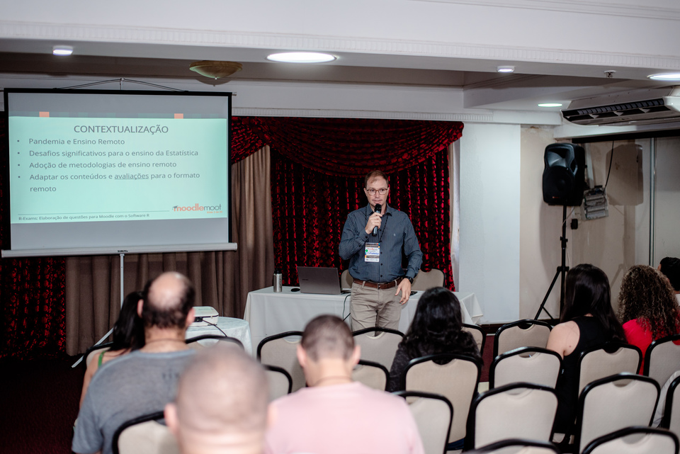 O professor Fernando Machado Haesbaert, lotado na Pró-Reitoria de Avaliação e Planejamento (Proap) da UFT, participou do MoodleMoot 2024, realizado em Brasília entre os dias 21 e 23 de agosto. Na ocasião, o professor ministrou a palestra intitulada "R-Exams: Elaboração de questões para Moodle com o Software R".
