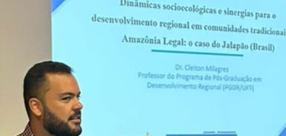 Durante o evento, o Prof. Dr. Cleiton Milagres apresentou um estudo intitulado "Dinâmicas Socioecológicas e Sinergias para o Desenvolvimento Regional em Comunidades Tradicionais da Amazônia Legal: O Caso do Jalapão (Brasil)". Sua apresentação destacou a importância das sinergias e das dinâmicas socioecológicas para o desenvolvimento sustentável das comunidades tradicionais do Jalapão, oferecendo uma visão detalhada dos desafios e oportunidades na região.