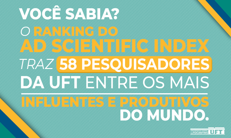 Foi divulgado o ranking do AD Scientific Index, que lista os pesquisadores mais influentes e produtivos do mundo. Na listagem, constam 58 pesquisadores da Universidade Federal do Tocantins (UFT), que se destacaram pelo desempenho - em termos de produção - e impacto de seus estudos, em seus respectivos campos de pesquisa. O Índice é um dos mais importantes no campo científico - e utiliza critérios bastante sólidos para determinar quais são os melhores pesquisadores envolvidos.