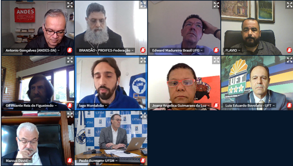 A Associação Nacional das Instituições Federais de Ensino Superior (Andifes) realizou na última quinta-feira (07) reunião remota com a presença de representantes de instituições representativas dos segmentos da comunidade universitária, tais como a Andes, UNE, Fasubra e Proifes, para tratar sobre a conjuntura atual e previsões para o próximo ano.
