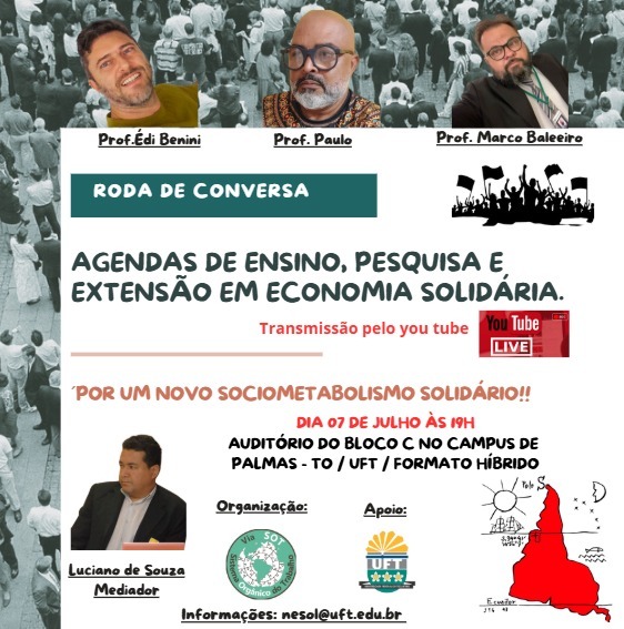 Será realizada no dia 07 de julho, a roda de conversa "Agendas de Ensino, Pesquisa e Extensão em Economia Solidária: Por um novo sociometabolismo solidário!". O evento será realizado às 19h, no Auditório do Bloco C, no Câmpus de Palmas, com transmissão ao vivo também pelo YouTube.