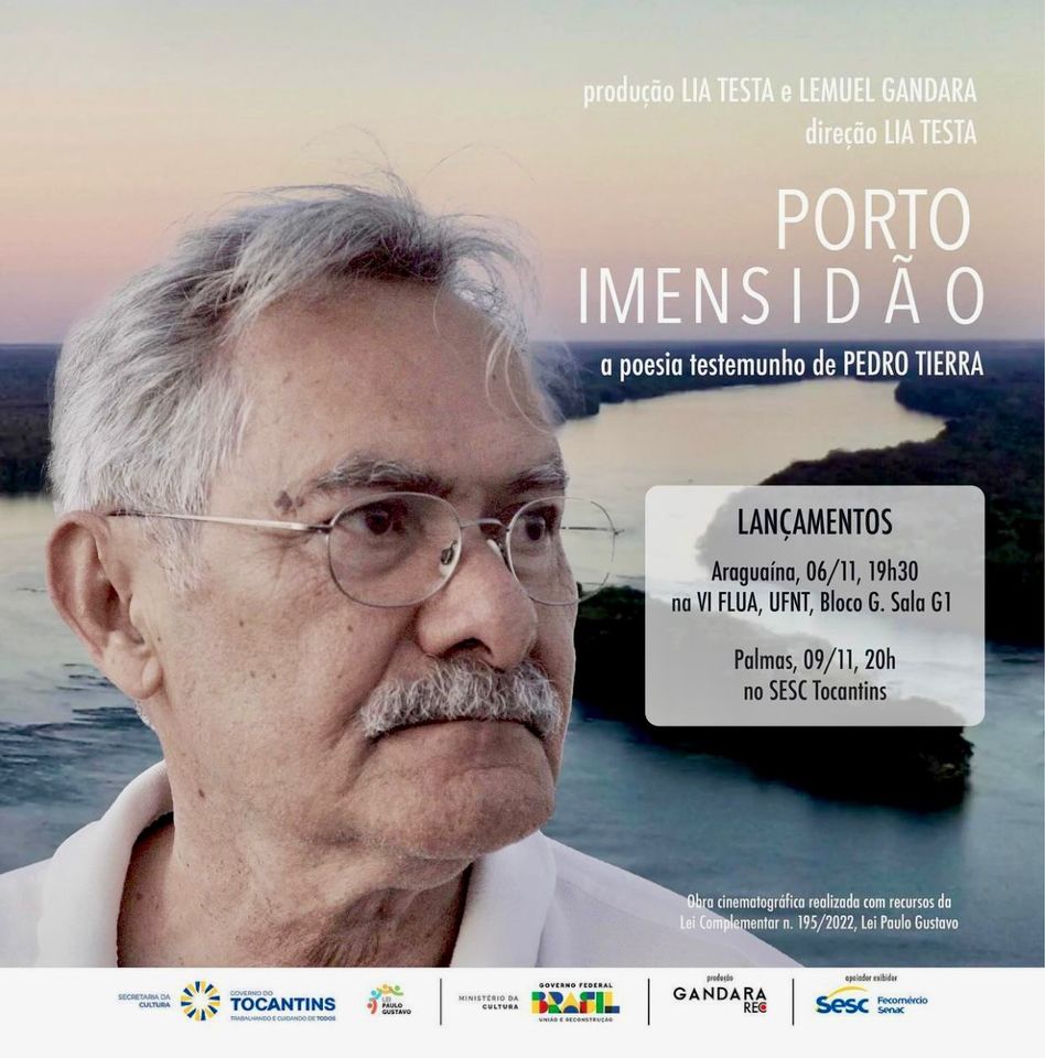 Neste sábado (9), será lançado em Palmas, no CineSesc, a partir das 20h, o documentário “Porto Imensidão”, que retrata a vida e a obra do poeta Hamilton Pereira da Silva, conhecido pelo pseudônimo de Pedro Tierra. A película é dirigida por Lia Testa e produzida por Lemuel Gandara, tem 30 minutos de duração e foi realizada com recursos da Lei Complementar no 195/2022 (Lei Paulo Gustavo). O filme explora a trajetória poética de Tierra durante o período de encarceramento na Ditadura Militar, um dos capítulos mais sombrios da história recente do Brasil.