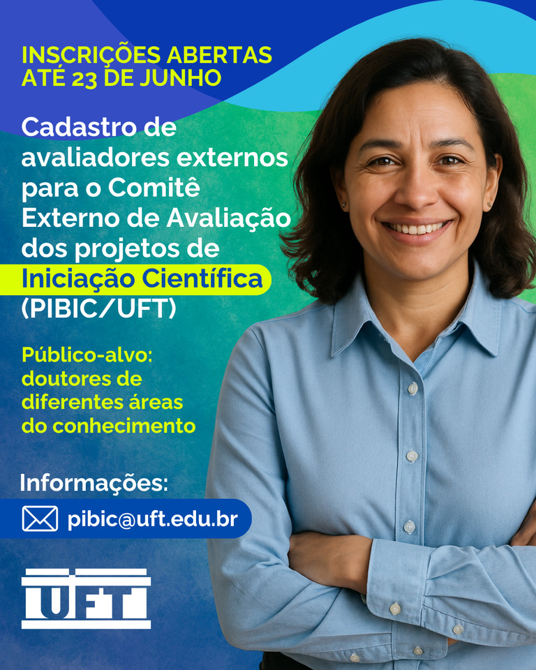 A Universidade Federal do Tocantins (UFT), por meio da Pró-Reitoria de Pesquisa e Pós-Graduação (Propesq), está com inscrições abertas até o dia 23 de junho para o cadastro de avaliadores externos interessados em compor o Comitê Externo de Avaliação dos projetos de Iniciação Científica (Pibic) da Univerdade. A seleção é voltada para pesquisadores com título de doutor, de diferentes áreas do conhecimento, que tenham experiência e reconhecimento em suas áreas de atuação.
