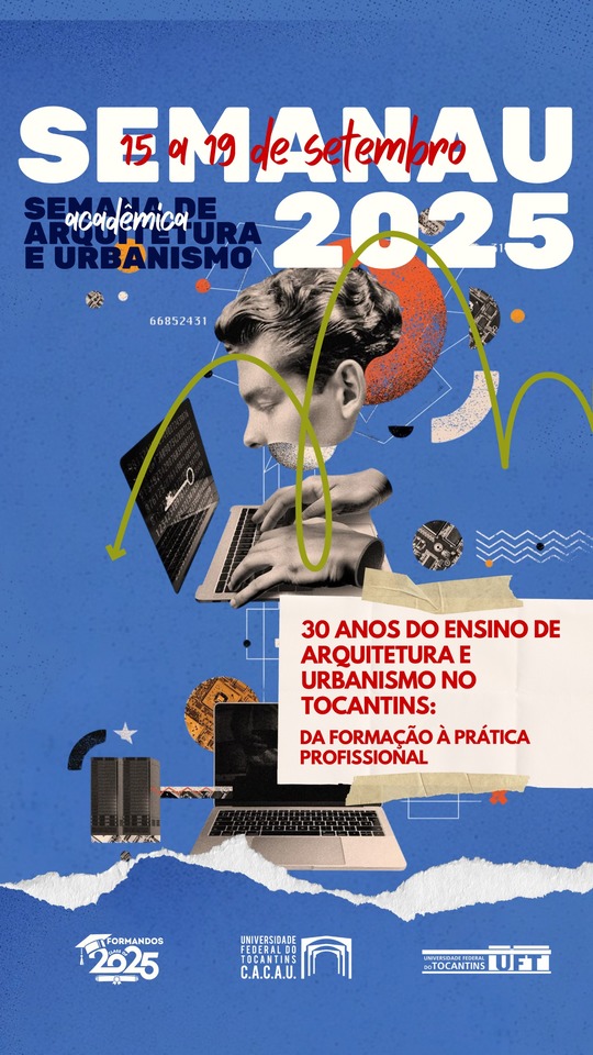 De 15 a 19 de setembro, o curso de Arquitetura e Urbanismo da Universidade Federal do Tocantins (UFT) realiza a Semanau 2025 – Semana Acadêmica de Arquitetura e Urbanismo, em comemoração aos 30 anos do ensino da área no estado. O evento acontece no Bloco 1 da UFT, em Palmas, e reúne estudantes, professores, profissionais e interessados na área.
