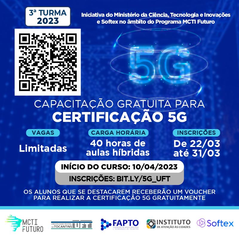 A Universidade Federal do Tocantins (UFT), por meio de seu Instituto de Atenção às Cidades (IAC) e em parceria com a Fapto e Softex, oferece curso de capacitação em 5G - uma Iniciativa do Ministério da Ciência, Tecnologia e Inovações e Softex no âmbito do Programa MCTI Futuro.