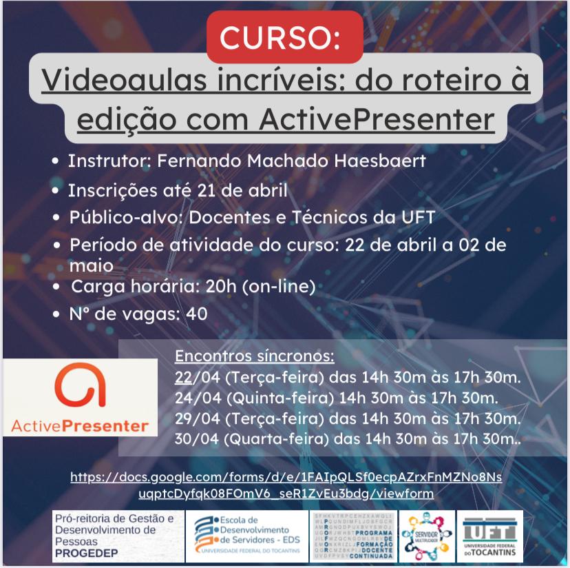 O curso “Videoaulas incríveis: do roteiro à edição com ActivePresenter” possui carga horária de 20 horas e será realizado entre os dias 22 de abril e 02 de maio de 2025. As inscrições estão abertas até o dia 21 de abril, com vagas ilimitadas. Os interessados podem se inscrever por meio do link abaixo: