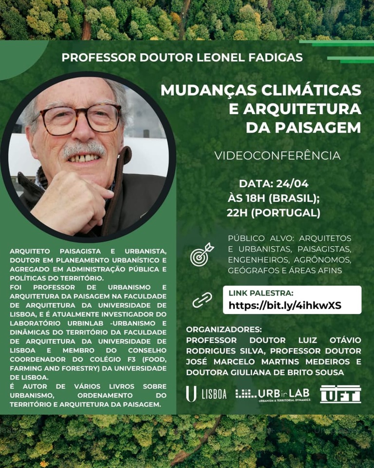 A Universidade Federal do Tocantins (UFT) realiza, nesta quinta-feira, dia 24 de abril de 2025, uma palestra online com o tema "Mudanças Climáticas e Arquitetura da Paisagem", ministrada pelo professor Leonel Fadigas, arquiteto paisagista e urbanista, doutor em Planejamento Urbanístico e especialista em Administração Pública e Políticas do Território. O evento será realizado de forma virtual às 18h (horário de Brasília) e 22h (horário de Portugal), com transmissão ao vivo no perfil oficial da UFT no YouTube.