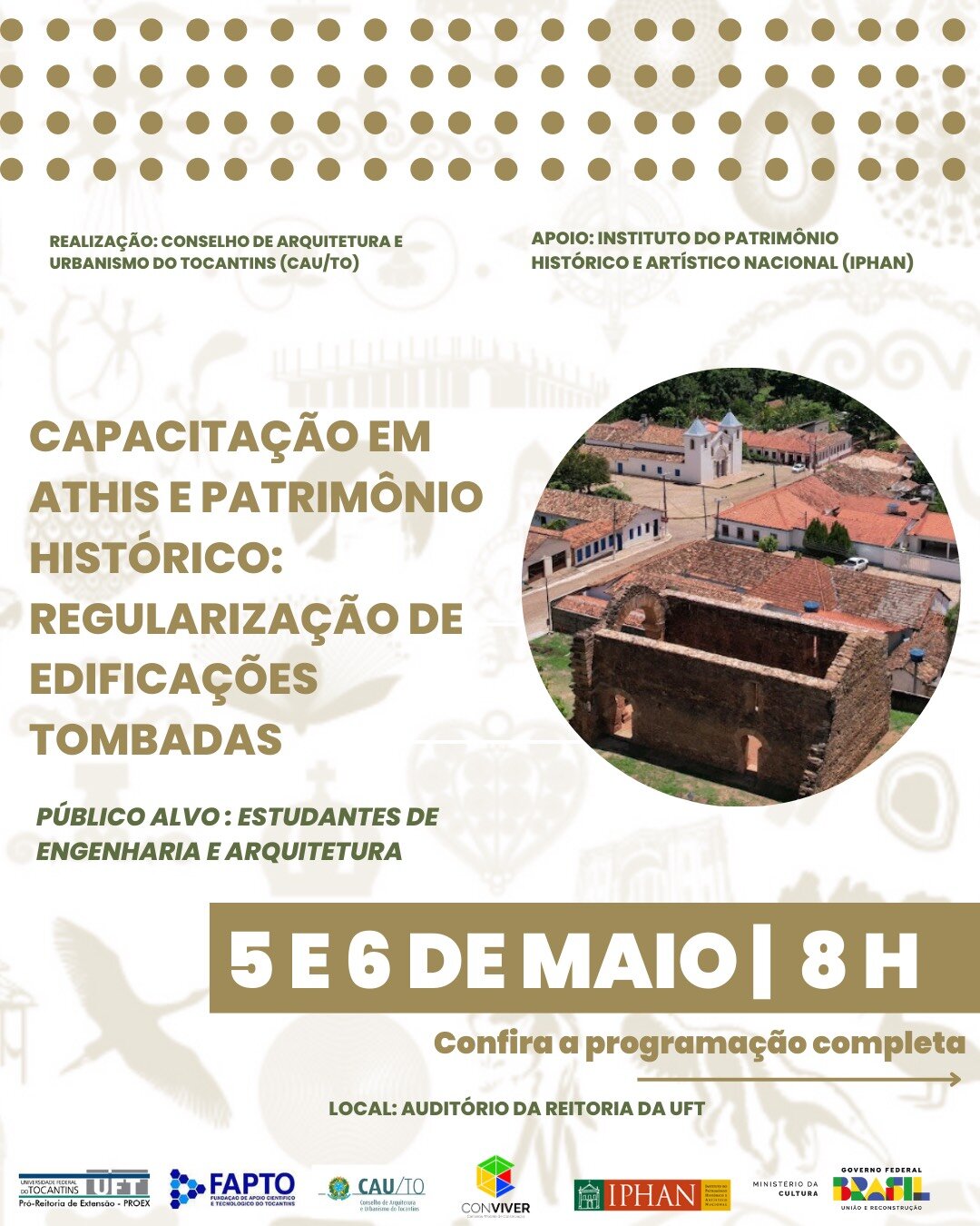 Nos dias 5 e 6 de maio de 2025, o auditório da Reitoria da Universidade Federal do Tocantins (UFT), em Palmas, será palco da capacitação "Athis e Patrimônio Histórico: Regularização de Edificações Tombadas". A atividade integra o Projeto Canteiro Modelo do Tocantins, idealizado pela Pró-Reitoria de Extensão (Proex) em parceria com a Fundação de Apoio Científico e Tecnológico do Tocantins (Fapto).