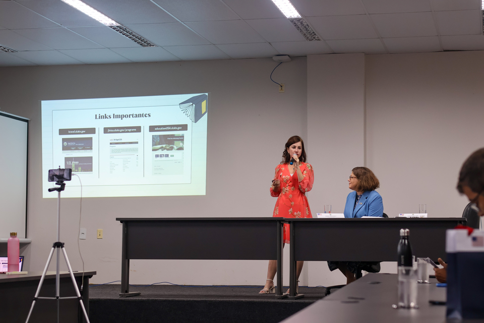Nancy explicou sobre os tipos de vistos voltados para os interessados em estudar no país norte-americano, enfatizando a importância de os acadêmicos buscarem informações no sítio da Embaixada na internet. A assistente Marisa discriminou as opções de estudos e programas possíveis de serem aderidos para que estudantes brasileiros possam desenvolver-se academicamente nos Estados Unidos. Enfatizou também sobre o processo de solicitação do visto, que pode sofrer diferenciação quanto ao tipo a depender do tempo de permanência e do tipo de estudo que será desenvolvido em solo estadunidense.