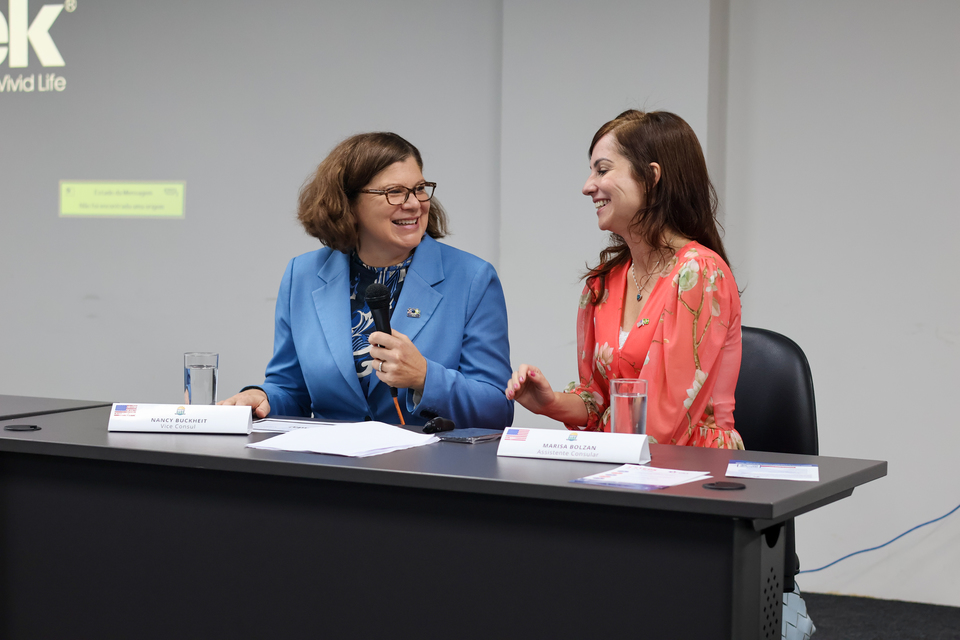 Na manhã desta terça-feira (5), no Auditório dos Conselhos no prédio da Reitoria da UFT, ocorreu a palestra "Oportunidades Acadêmicas e de Intercâmbio nos Estados Unidos" com a vice-cônsul da Embaixada dos Estados Unidos no Brasil, Nancy Buckheit; ela estava acompanhada da assistente consular, Marisa Bolzan.