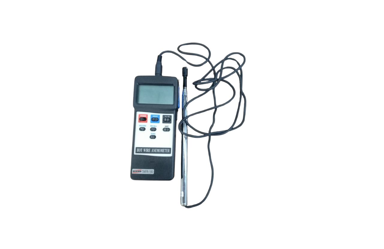 Instrumento que além de medir velocidade de vento em m/s, ft/min, km/h, mph, Knots, mede a temperatura do ar e calcula a vazão de ar em CFM (pés cúbicos por minuto). Efetua registros de máximas e mínimas e mostra a média das medições e conta com haste telescópica para acessar locais diversos durante suas medições.