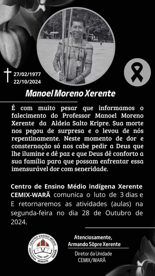 Neste momento de dor e tristeza, o Curso de Jornalismo e a UFT presta suas condolências a todos os amigos e familiares de Manoel Moreno Xerente.