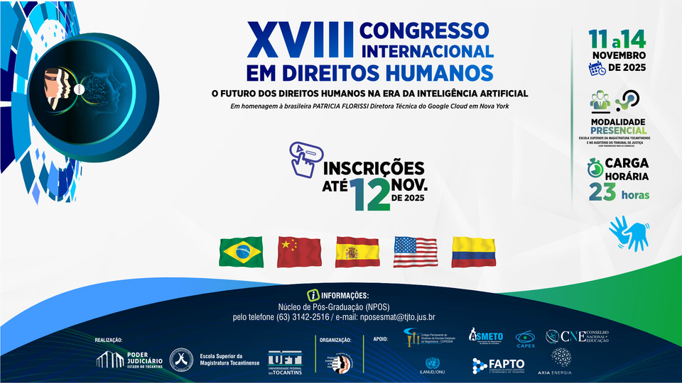 O XVIII Congresso Internacional em Direitos Humanos começa nessa terça-feira, 11 de novembro, com a realização dos minicursos presenciais. O evento é promovido pela Escola Superior da Magistratura Tocantinense (Esmat), em parceria com o Tribunal de Justiça do Estado do Tocantins (TJTO), com a Universidade Federal do Tocantins (UFT) e com o Programa de Mestrado Profissional em Prestação Jurisdicional e Direitos Humanos (PPGPJDH).