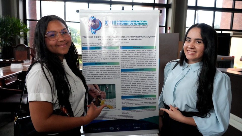 Do Centro Universitário Unitop, as estudantes de Direito Vitória Rafaela Lopes Tavares e Sarah Lohani apresentaram o trabalho: “O papel do artesanato como instrumento de resocialização e remissão de penas para mulheres da Unidade Penal Feminina de Palmas”.