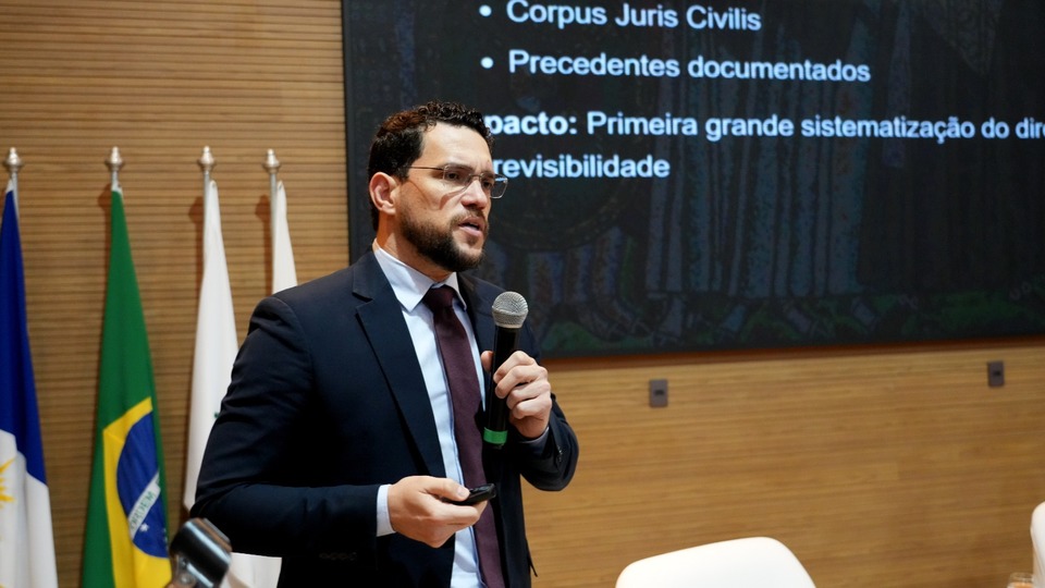 Em sua fala, o desembargador Marco Villas Boas destacou como a filosofia do Direito como Integridade, de Ronald Dworkin, inspira uma nova arquitetura para o uso da Inteligência Artificial no Judiciário. Com base em seu projeto de pós-doutorado na USP, desenvolvido em cooperação com o Grupo Smart Cities BR, a EACH/USP, o Copedem e a Esmat, e com apoio tecnológico da startup Taqui-AI, o magistrado apresentou o Método Dialógico de Múltiplas Respostas (DMR) e o Projeto Hórus.