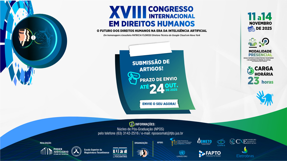 Termina, nessa sexta-feira, 24 de outubro, o prazo para envio de resumos expandidos que serão apresentados no XVIII Congresso Internacional em Direitos Humanos, promovido pela Escola Superior da Magistratura Tocantinense (Esmat) e pelo Programa de Pós-Graduação em Prestação Jurisdicional e Direitos Humanos (PPGPJDH), em parceria com a Universidade Federal do Tocantins (UFT).