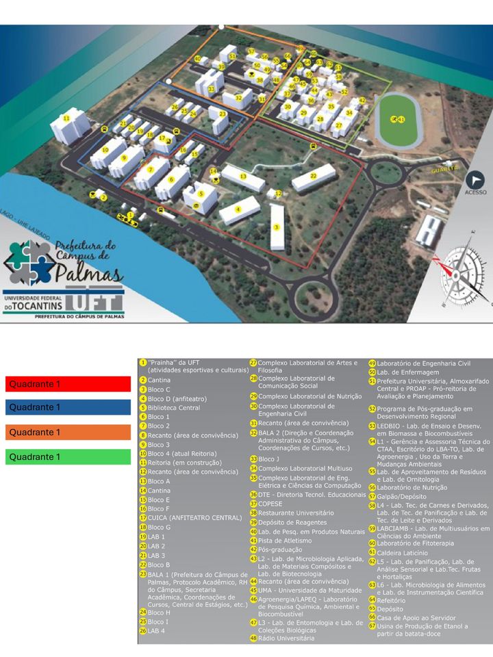A imagem mostra o mapa 3D do Câmpus de Palmas da Universidade Federal do Tocantins (UFT), produzido pela Prefeitura do Câmpus de Palmas. O mapa apresenta a disposição dos prédios e espaços do campus, numerados de 1 a 51, com uma legenda detalhando o nome e a função de cada bloco, laboratório, setor administrativo e área de convivência.