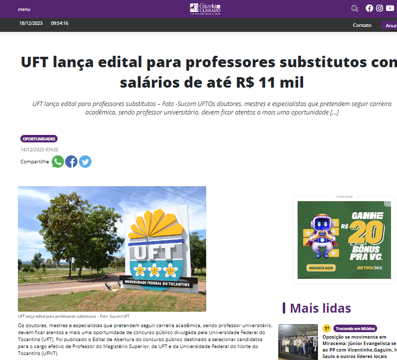 Matéria disponível: https://gazetadocerrado.com.br/uft-lanca-edital-para-professores-substitutos-com-salarios-de-ate-r-11-mil/
