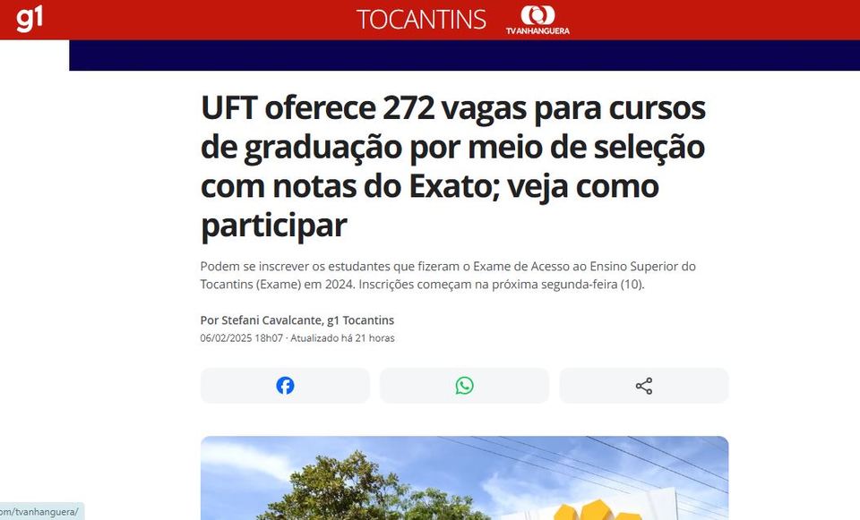 UFT oferece 272 vagas para cursos de graduação por meio de seleção com notas do Exato